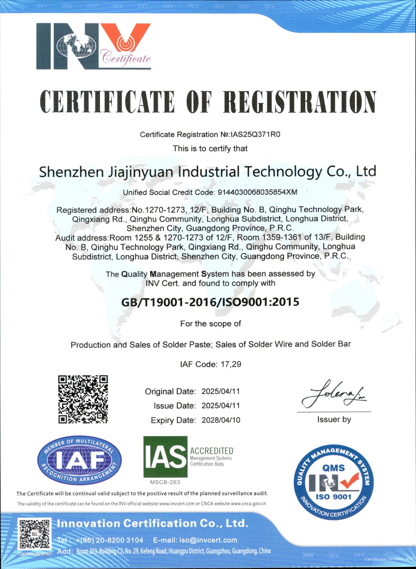 ISO9001佳金源認(rèn)證證書